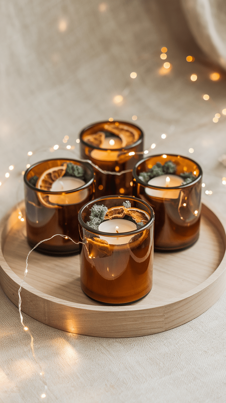 Kombiniere Gläser in verschiedenen Größen und fülle sie mit Moos, Orangenscheiben oder Zimt. Stelle sie auf ein schlichtes Tablett und umrahme sie mit einem feinen Lichterdraht.