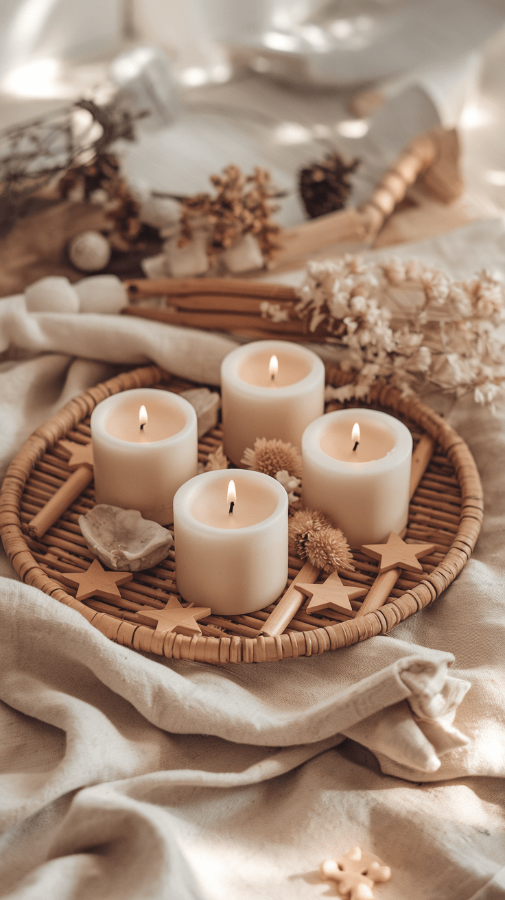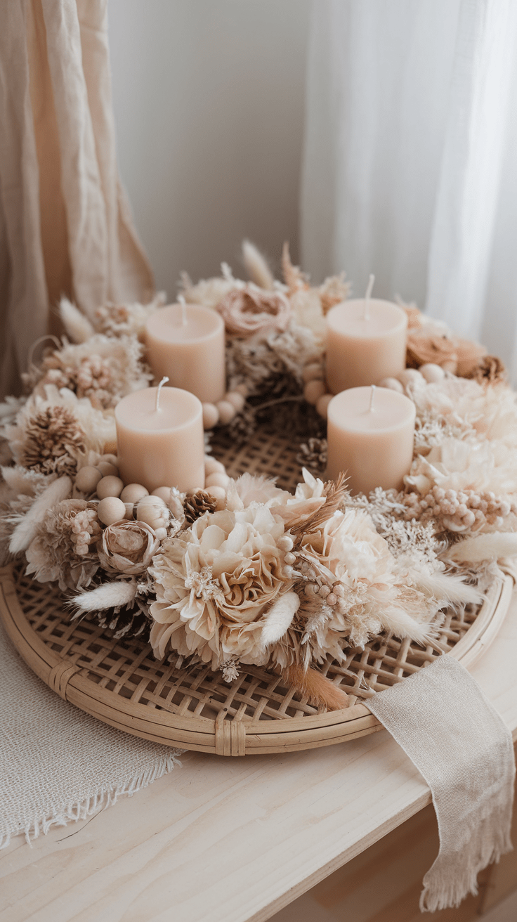 Verwende als Grundlage ein flaches Rattantablett oder eine geflochtene Schale. Darauf platzierst du vier Kerzen in sanften Tönen wie Creme, Greige oder Blush. Ergänze die Deko mit kleinen Trockenblumen, Holzsternen oder einem zarten Leinenband. Das Ergebnis: ein harmonisches Zusammenspiel aus natürlichen Materialien und sanftem Licht ganz ohne Glitzer oder Überladung.