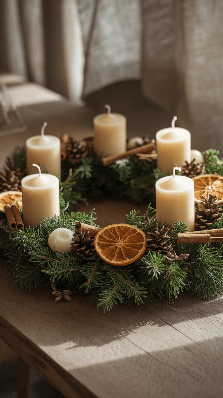 Verwende eine klassische Basis aus Tannenzweigen und ergänze sie mit getrockneten Orangenscheiben, Sternanis, Nelken und Zimtstangen. Dazwischen platzierst du vier Kerzen in warmem Creme oder hellem Karamell. Wenn du magst, kannst du kleine Holzscheiben oder braune Papieranhänger hinzufügen, das verstärkt den natürlichen Charme.