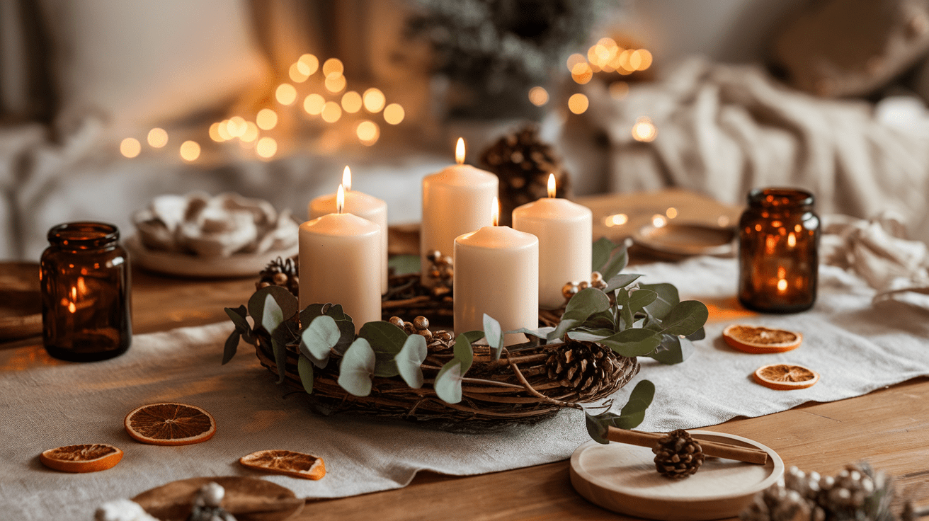 Ein rundes Metall- oder Holztablett bildet die Basis. Arrangiere darauf die Kerzen, ein paar kleine Zapfen oder Eukalyptusblätter, und fertig ist ein reduzierter Look, der perfekt in jedes skandinavische oder Boho-inspirierte Zuhause passt. Weniger ist hier wirklich mehr – das sanfte Licht sorgt für die ganze Magie.