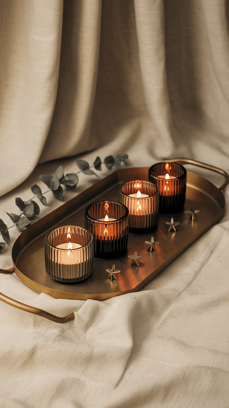 Verwende LED-Lichter oder kleine Teelichter in Rauchglas – so spiegelt sich das Licht sanft im Metall und erzeugt einen eleganten, modernen Schimmer.