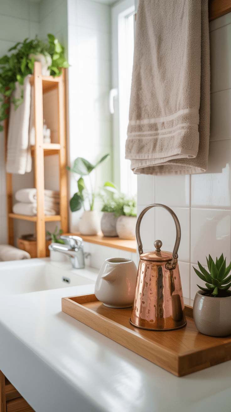 Im Badezimmer kannst du eine kleine Kaffeekanne als stilvollen Aufbewahrer für Ringe und Armbänder nutzen. Der warme Metalllook harmoniert mit flauschigen Handtüchern und einer dezenten Naturstein-Optik. So entsteht eine Spa-ähnliche Atmosphäre, in der du gern verweilst.