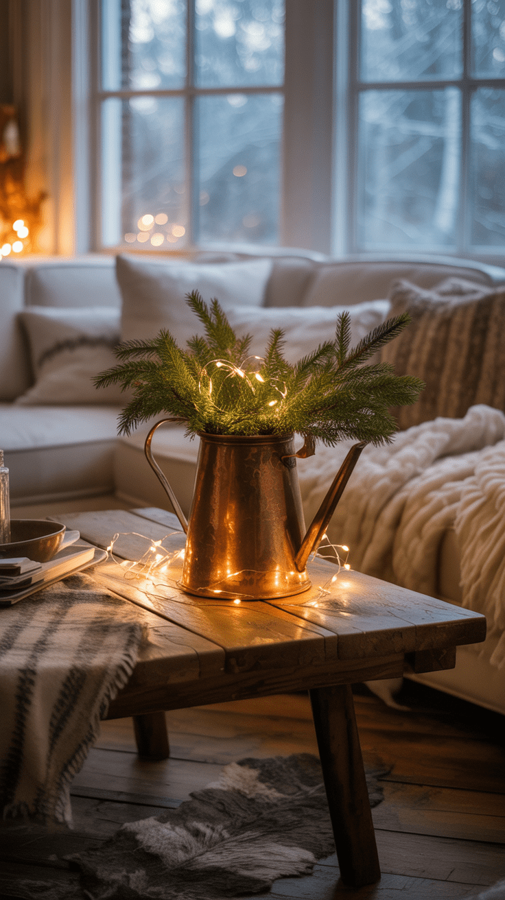 Fülle etwas trockenes Moose oder Zeitungspapier in den Kannenboden, um die Zweige zu fixieren. Webe eine dezente LED-Lichterkette hindurch und häng ein paar kleine Christbaumkugeln an den Ausguss. Platziere das Ensemble mittig auf dem Tisch oder neben dem Fenster.