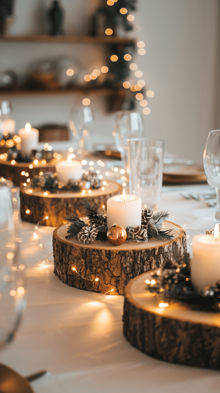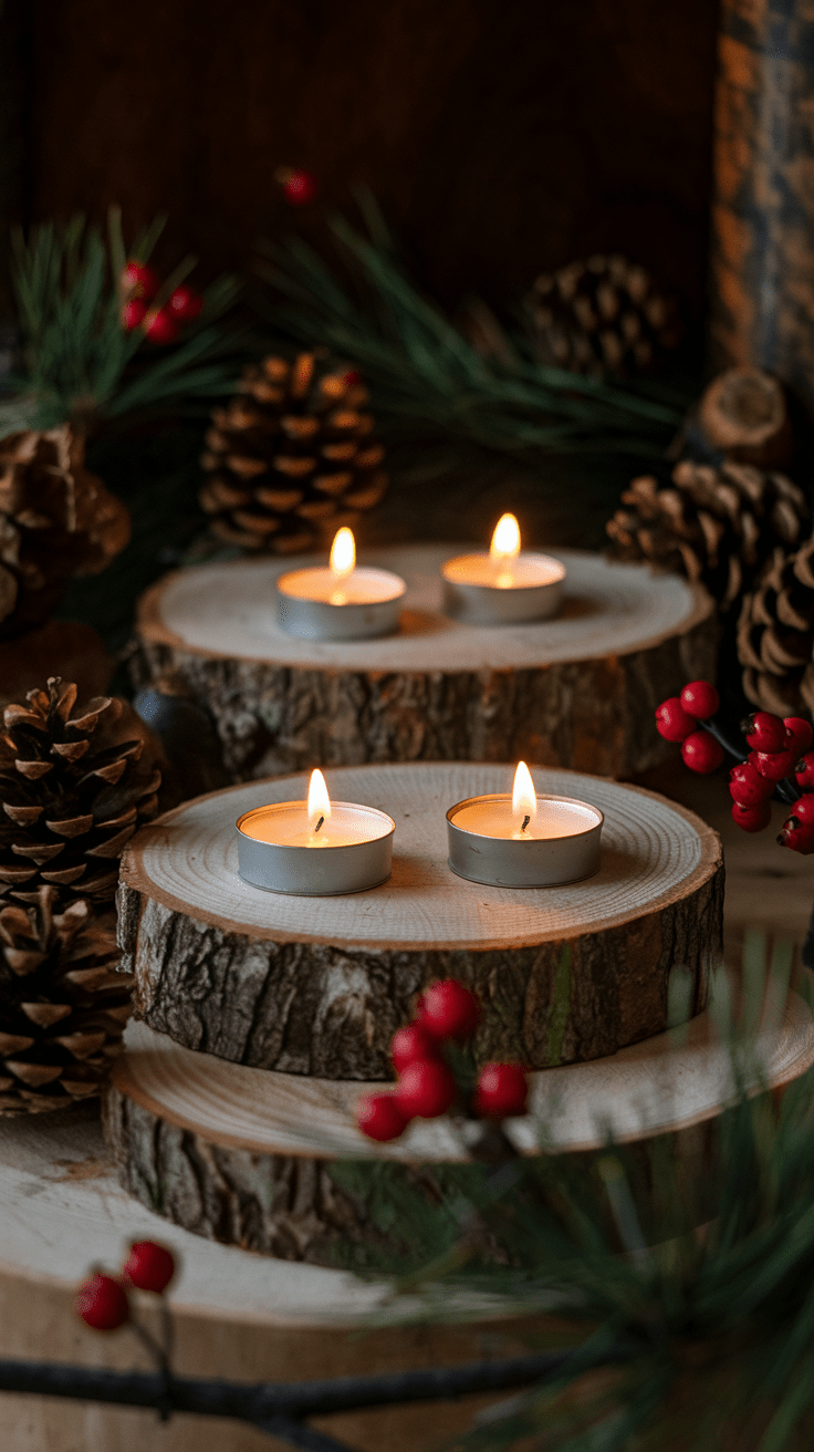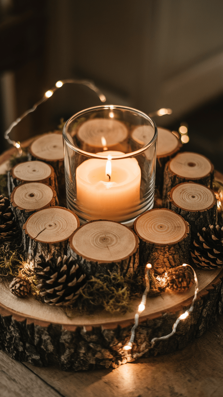 Kerzen sorgen für eine warme, einladende Stimmung. Mit Baumscheiben als Halter bringst du ein Stück Natur ins Spiel. Diese Kombination wirkt besonders harmonisch, weil das Holz das flackernde Licht sanft reflektiert. Außerdem kannst du Größe und Anzahl der Kerzen variieren, je nachdem, ob du es gemütlich oder festlich haben möchtest.