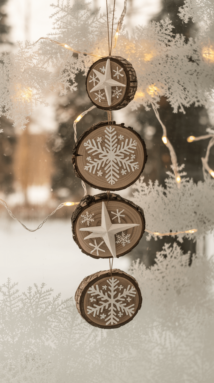 Fensterdeko ist oft der unterschätzte Bereich bei der Weihnachtsgestaltung. Dabei wirken hängende Baumscheiben besonders leicht und verspielt. Sie drehen sich sanft im Licht und lassen sich jedes Jahr neu bemalen. So entstehen kleine Kunstwerke, die dein Zuhause von innen und außen schmücken.