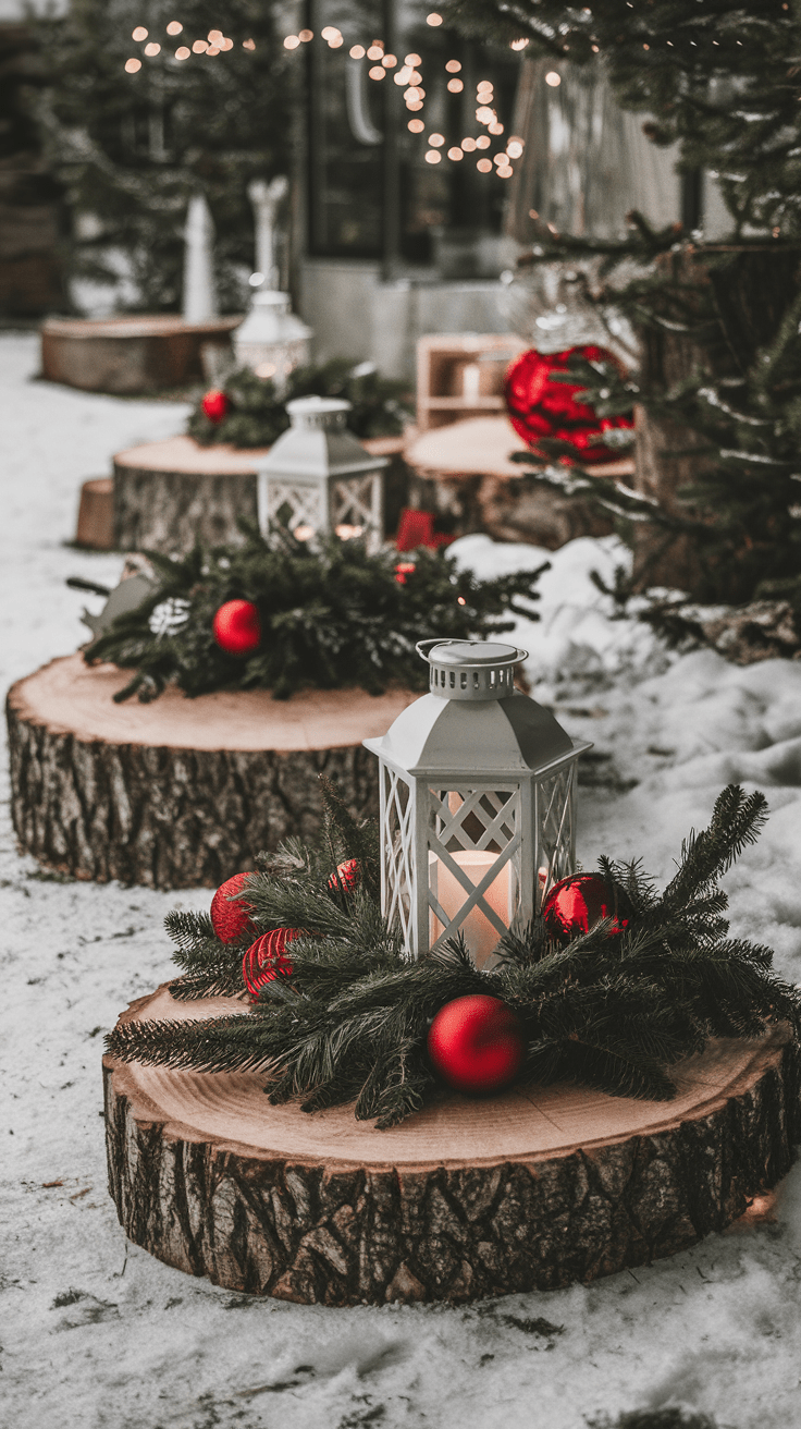 Der Hauseingang ist die Visitenkarte deines Zuhauses. Große Baumscheiben als Basis für Laternen oder Figuren machen den Bereich sofort einladender. Sie sind wetterfest, robust und lassen sich wunderbar mit Tannengrün kombinieren. So entsteht eine natürliche Deko, die auch draußen lange hält.