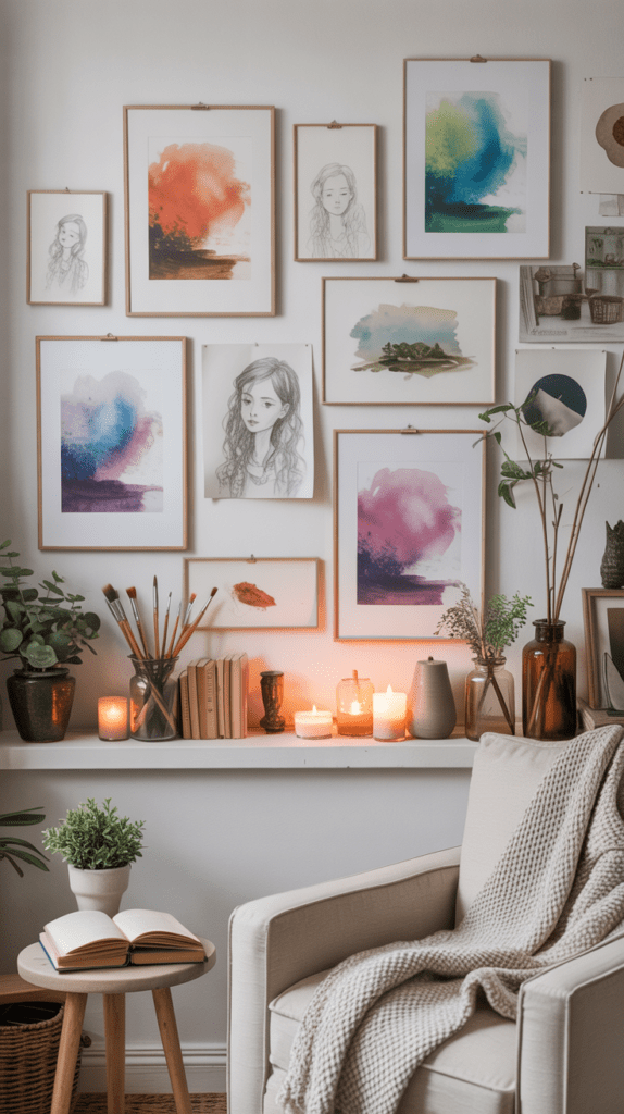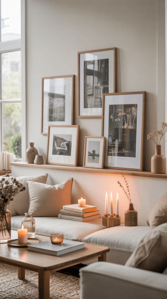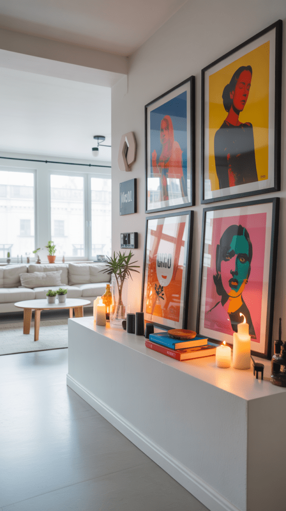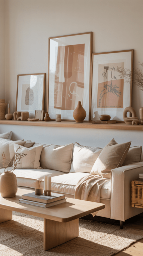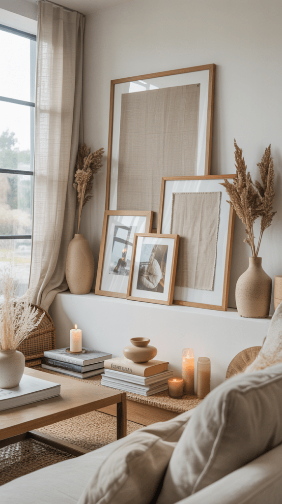 Wähle gerahmte Kunstdrucke in hellen Holzrahmen und stelle kleine Topfpflanzen davor. So entsteht Tiefe und du kannst die Pflanzen je nach Jahreszeit austauschen.