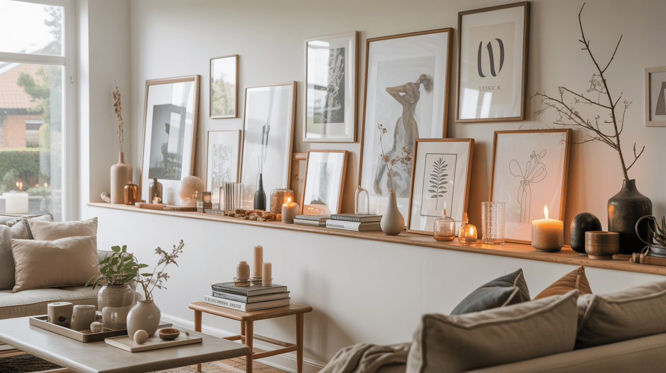 Einheitliche Naturholzleisten bieten eine warme Basis für dekorative Hingucker. Kombiniere gerahmte Kunst mit kleinen Vasen oder Keramikobjekten in ähnlichen Farbtönen. Die Ton-in-Ton-Präsentation strahlt Harmonie und Ruhe aus.