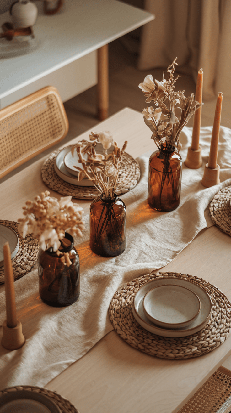 Beginne mit einem Leinentischläufer in einem sanften Beigeton. Darauf kommen Kerzen in verschiedenen Höhen, getrocknete Gräser oder kleine Zweige in bernsteinfarbenen Vasen. Kombiniere dazu mattes Keramikgeschirr, Leinenservietten und vielleicht ein paar Holzdetails. Der Look wirkt besonders schön, wenn nicht alles perfekt gleich ist – das Unvollkommene macht ihn lebendig.