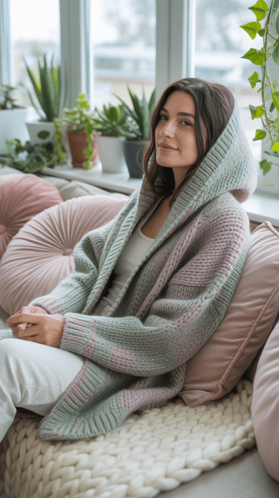 Ein Cardigan mit Kapuze kombiniert Komfort mit Zweckmäßigkeit. Die Kapuze schützt an kühlen Tagen und verleiht dem Modell einen sportlichen Charakter. Das einfache Grundmuster ermöglicht eine schnelle Umsetzung auch an Abenden ohne viel Konzentration.