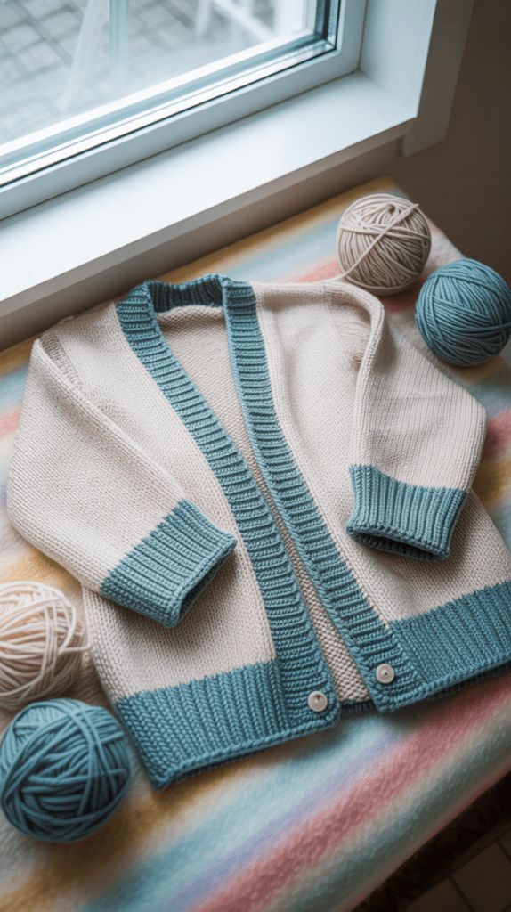 Ein zweifarbiger Cardigan setzt gezielte Akzente auf Manschetten, Saum und Kragen. Der Farbübergang wirkt besonders, wenn er in kontrastreichen Tönen gewählt wird. Diese Idee nutzt das Fair Isle Prinzip ohne komplizierte Mustervorlage.