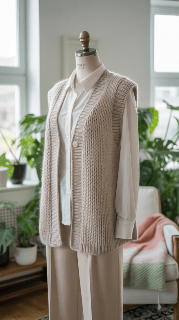 Diese ärmellose Strickweste eignet sich gut als leichte Cardigan Alternative. Sie lässt den Arm frei, schafft aber dennoch eine wärmende Schicht. Besonders im Büro oder im Übergangswetter hält sie warm, ohne aufzutragen.