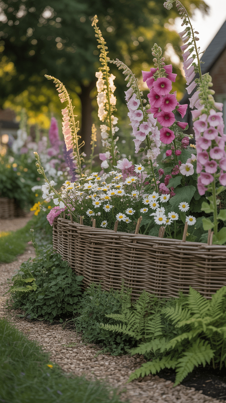 Cottage Gärten sind bekannt für ihre liebevollen Details – und ein Flechtzaun aus Weide ist eines davon. Er bringt Struktur, wirkt natürlich und grenzt Beete ab, ohne streng zu wirken. Besonders schön, wenn sich Stockrosen oder Cosmeen sanft darüber neigen.