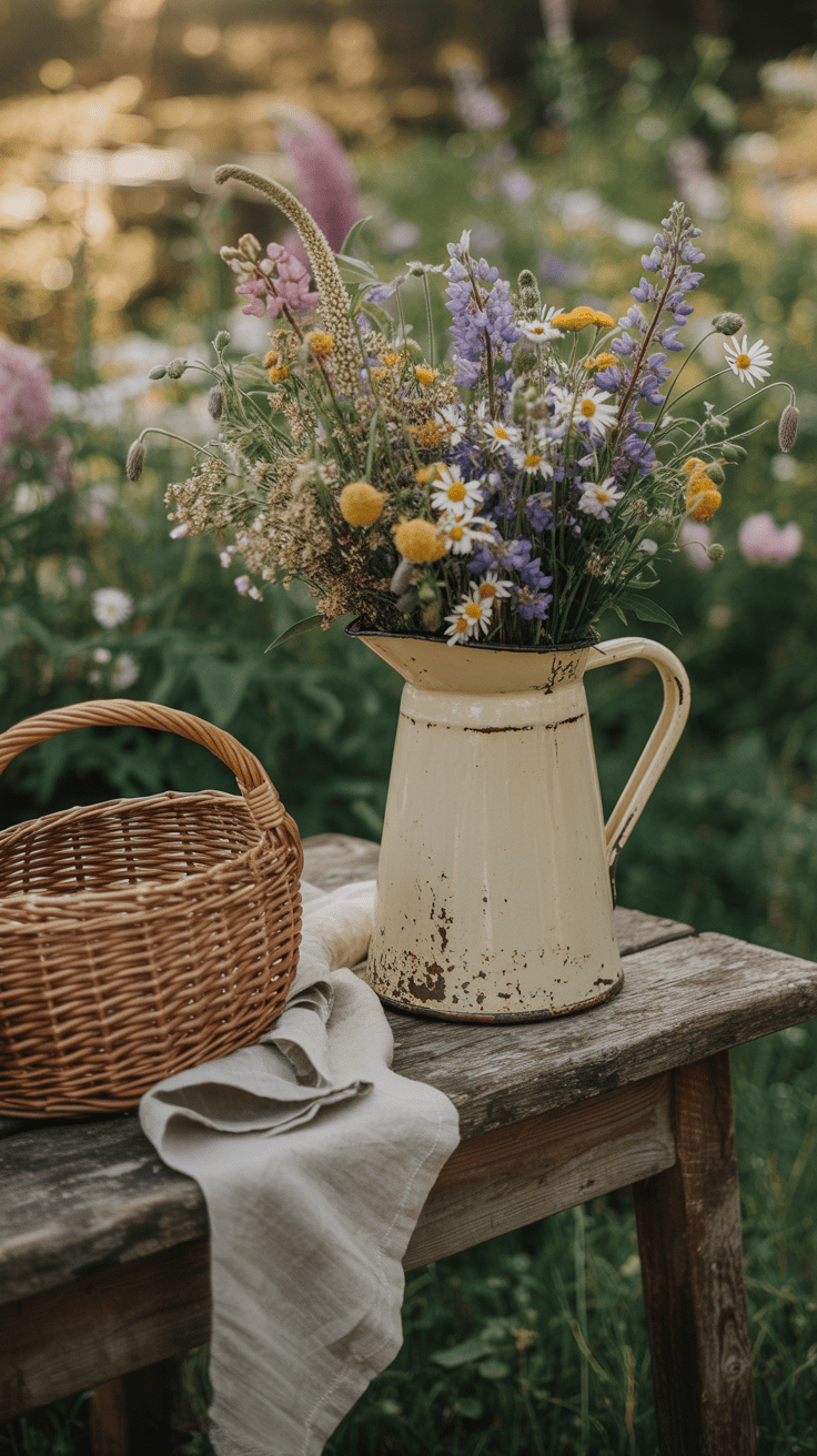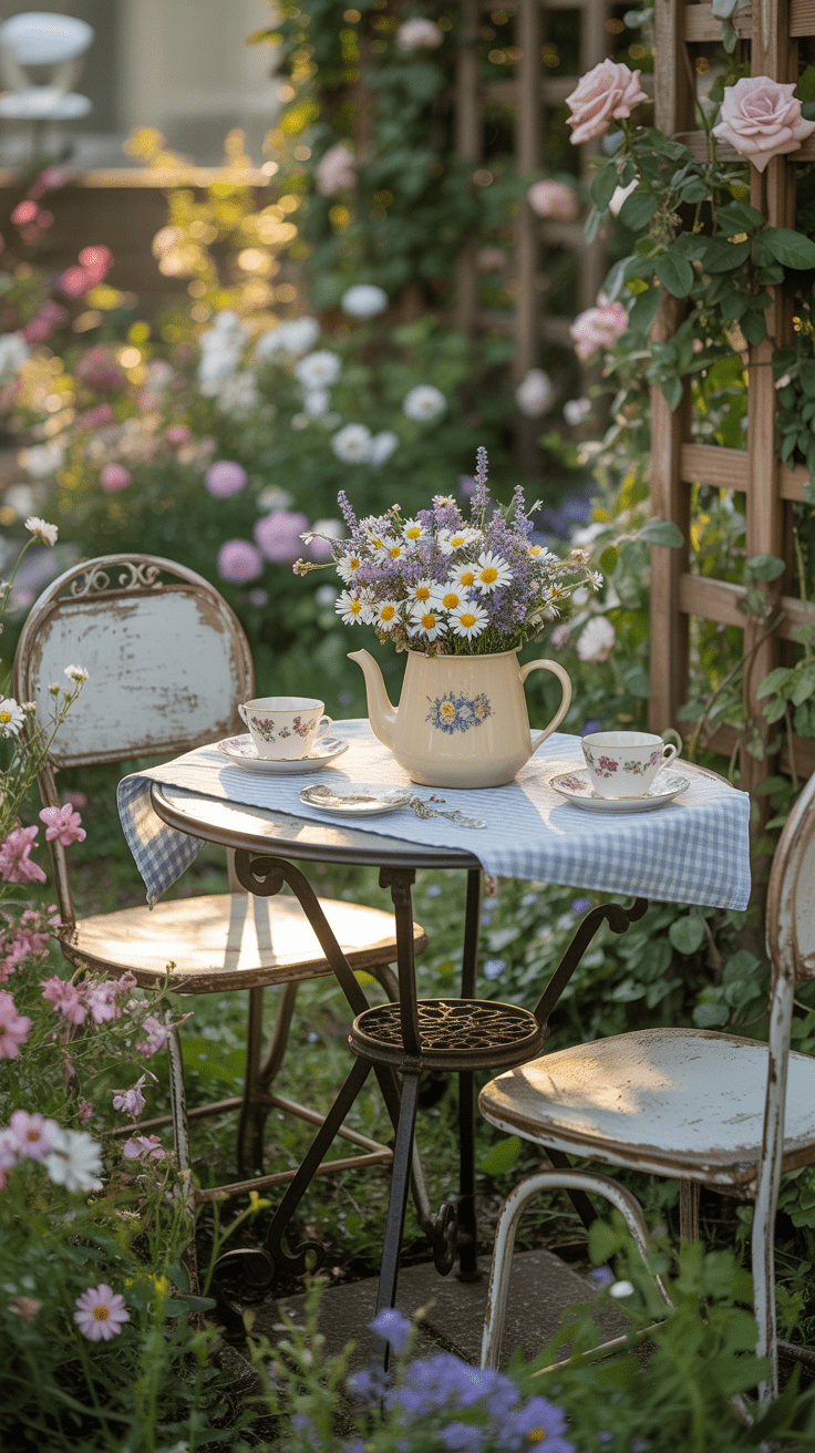 Ein wilder Garten braucht einen Platz zum Genießen. Ein kleiner Bistrotisch, zwei Stühle, eine gestreifte Tischdecke und ein Krug mit frisch geschnittenen Wiesenblumen – fertig ist dein Cottage-Café mitten im Grünen. Hier wird der Nachmittagstee zum Lieblingsmoment.