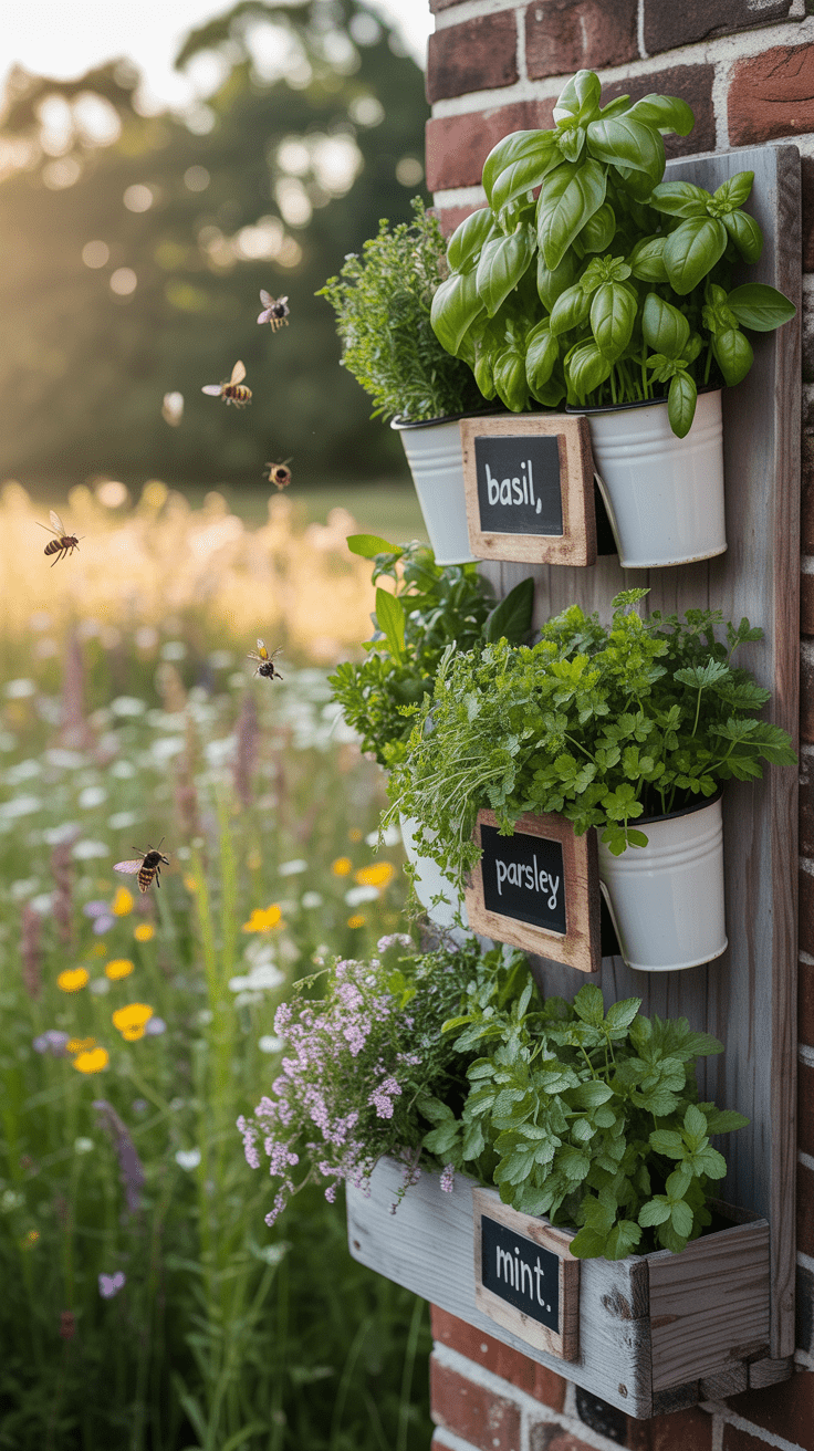 Wenn der Platz im Beet fehlt, geht’s einfach in die Höhe. Ein vertikaler Kräutergarten spart Fläche, sieht wunderschön aus und versorgt dich täglich mit frischen Aromen. Besonders schön wirkt er mit recycelten Töpfen, Dosen oder Holzkisten.