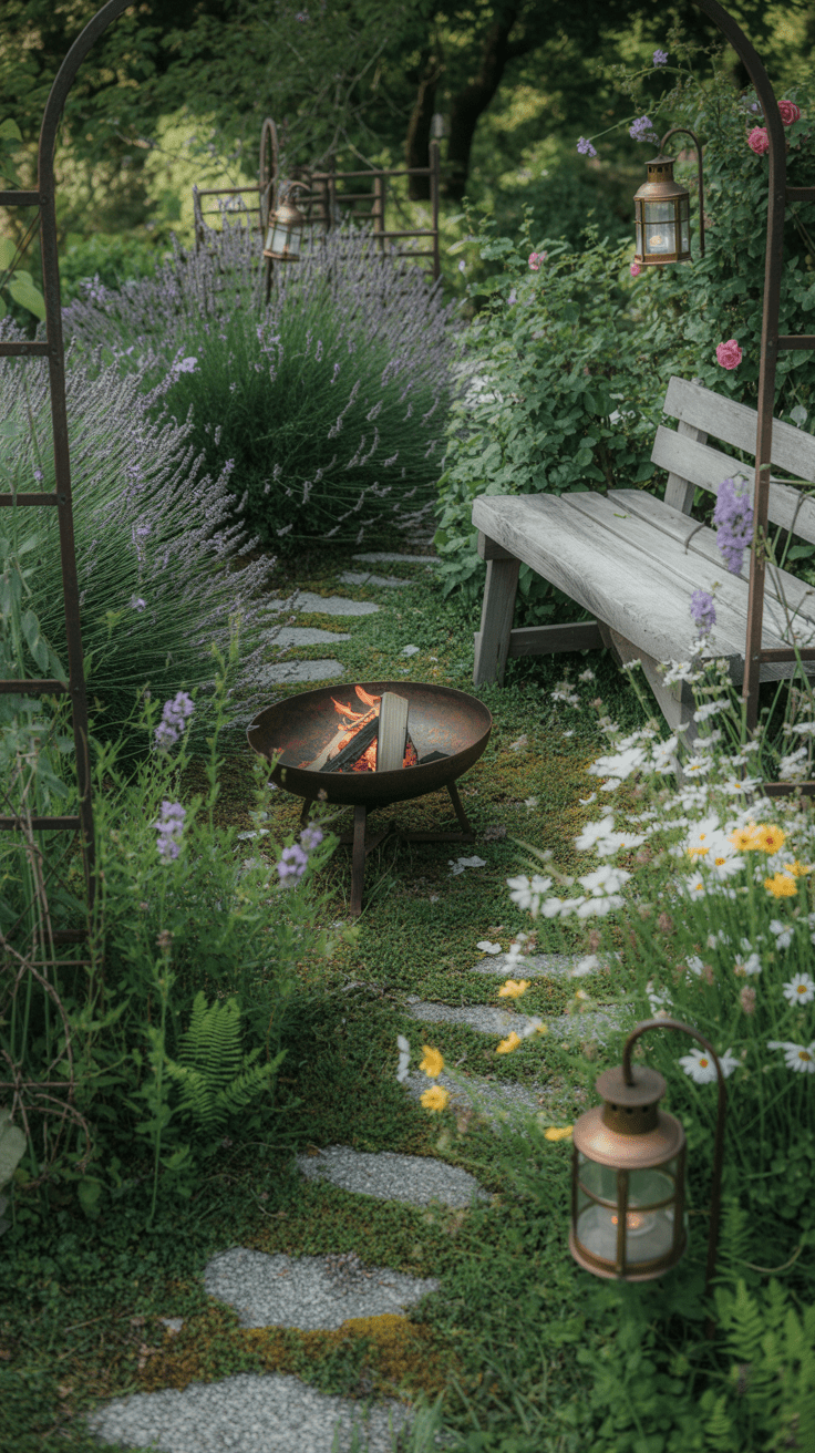 Romantisch, duftend und voller Farben: Hier wird die Feuerstelle zum Teil eines Blumenbeets. Alles wirkt leicht verwildert, aber liebevoll gepflegt.