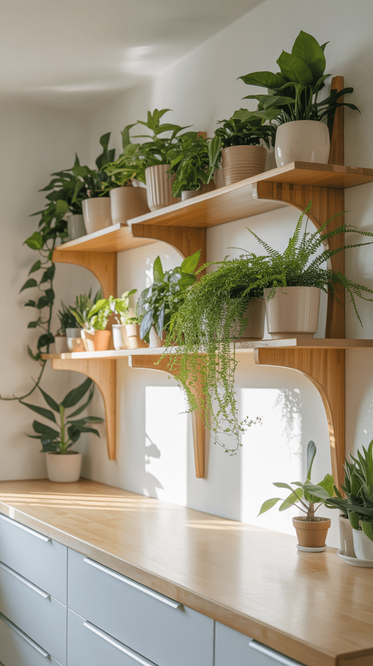 Holzregale verleihen deiner Küche Wärme und bieten ausreichend Fläche für Grünpflanzen und Kochutensilien. Durch die Kombination aus Holz und Blattwerk entsteht ein harmonisches Bild. Du kannst unterschiedliche Ebenen schaffen und so mit Formen und Höhen spielen.