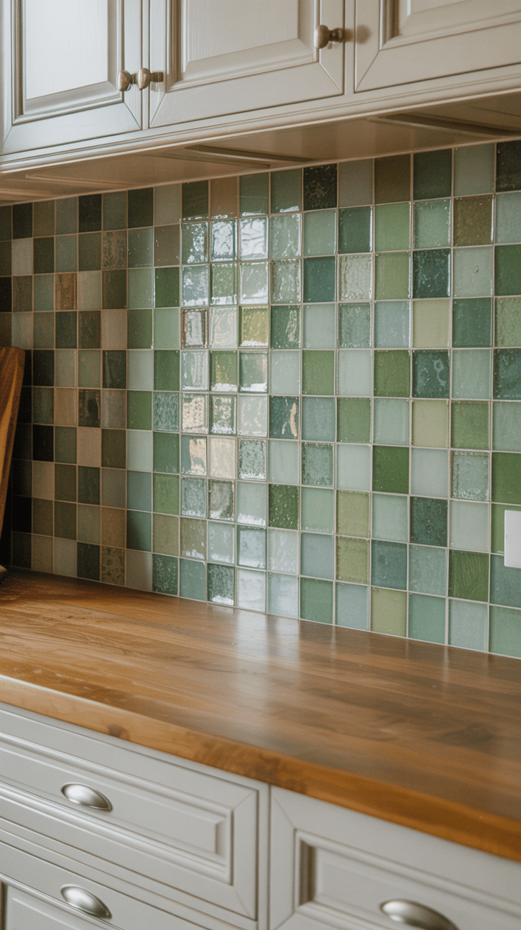 - Glas- oder Keramikfliesen in sanften Grünvarianten für lebendige Muster.