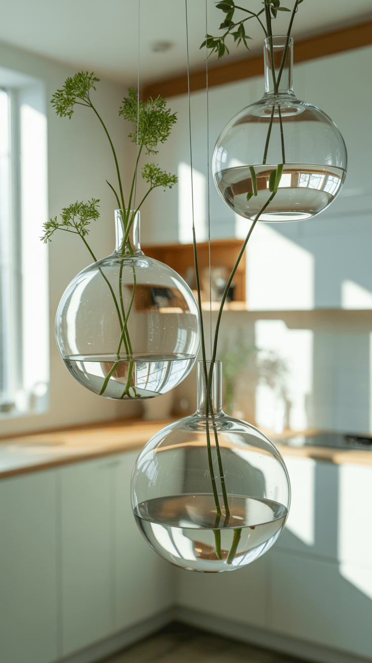 - Schlanke Glasvasen in variierenden Höhen für eine luftige Hängung.
