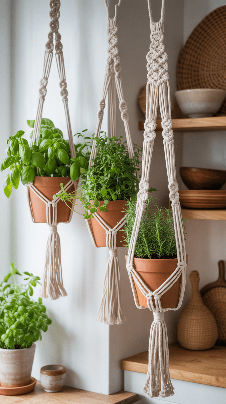 Makramee-Kräuterampeln verleihen deiner Küche einen bohohaften Touch und bringen Kräuterpflanzen in Augenhöhe. Die filigranen Knotenstrukturen wirken wie zarte Kunstwerke und bieten gleichzeitig Halt für deine Töpfe. Du genießt dadurch nicht nur frische Aromen beim Kochen, sondern auch ein dekoratives Element an der Decke.
