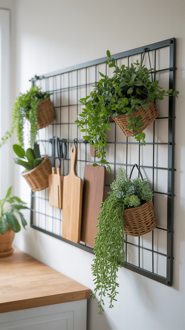 Ein dekoratives Metallgitter an der Küchenwand bietet Platz für kleine Hängekörbe und Übertöpfe. Die feine Gitterstruktur schafft ein grafisches Muster und integriert deine Pflanzen in das Gesamtbild. So entsteht eine leichte, zugleich strukturierte Wandfläche.