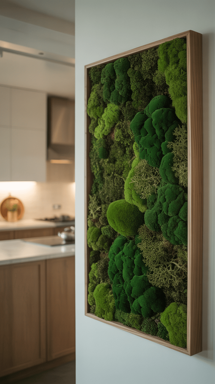 Moosbilder benötigen weder Erde noch Licht, um ihre Farbe zu behalten. Sie sind pflegeleicht und reduzieren die Raumgeräusche durch ihre natürliche Schalldämmung. So entsteht ein ruhiger Ort, der dich beim Kochen und Entspannen begleitet.