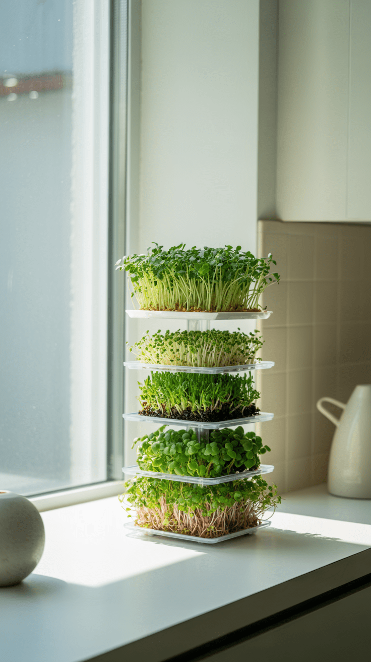 Sprossen wie Mungbohnen oder Radieschen keimen schnell und versorgen dich mit Vitaminen. Die offene Anordnung sorgt für genügend Luftzirkulation und beugt Schimmelbildung vor. Zusätzlich wirkt der Turm wie ein minimalistisches Dekoelement in modernem Schwarz oder Weiß.