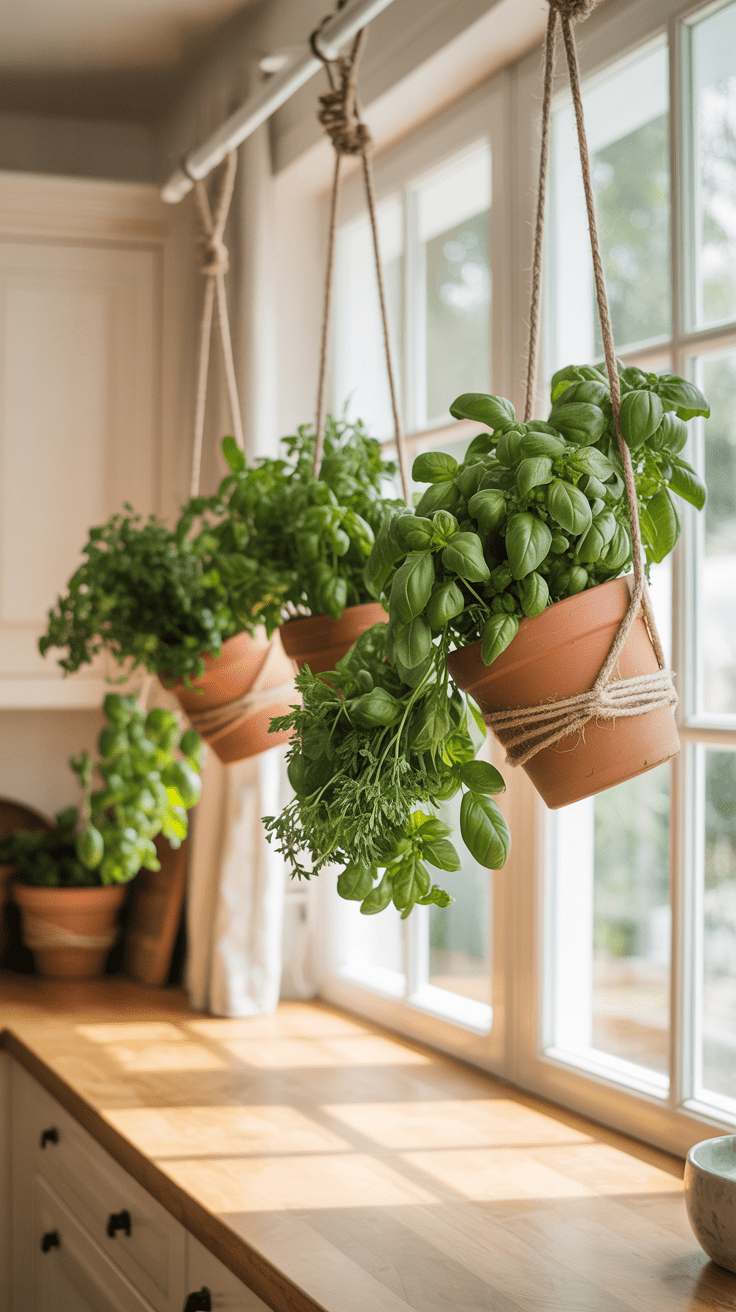 Mit ein paar einfachen Haken und Terrakottatöpfen an feinen Seilen verleihst du deiner Küche eine entspannte Leichtigkeit. Die warmen Farbtöne der Erde ergänzen helle Arbeitsflächen und schaffen einen natürlichen Kontrast. Frische Kräuter wie Basilikum oder Petersilie liegen so stets griffbereit und entfalten ihre Aromen direkt neben deinem Herd.