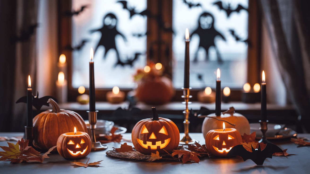 Lichtquellen wie Laternen, Kerzen oder Lichterketten, dazu Kürbisse in allen Formen. Spinnweben, Geister und Fledermäuse sind Klassiker. Für draußen wirkt ein Türkranz oder ein kleiner Vorgarten-Friedhof perfekt.