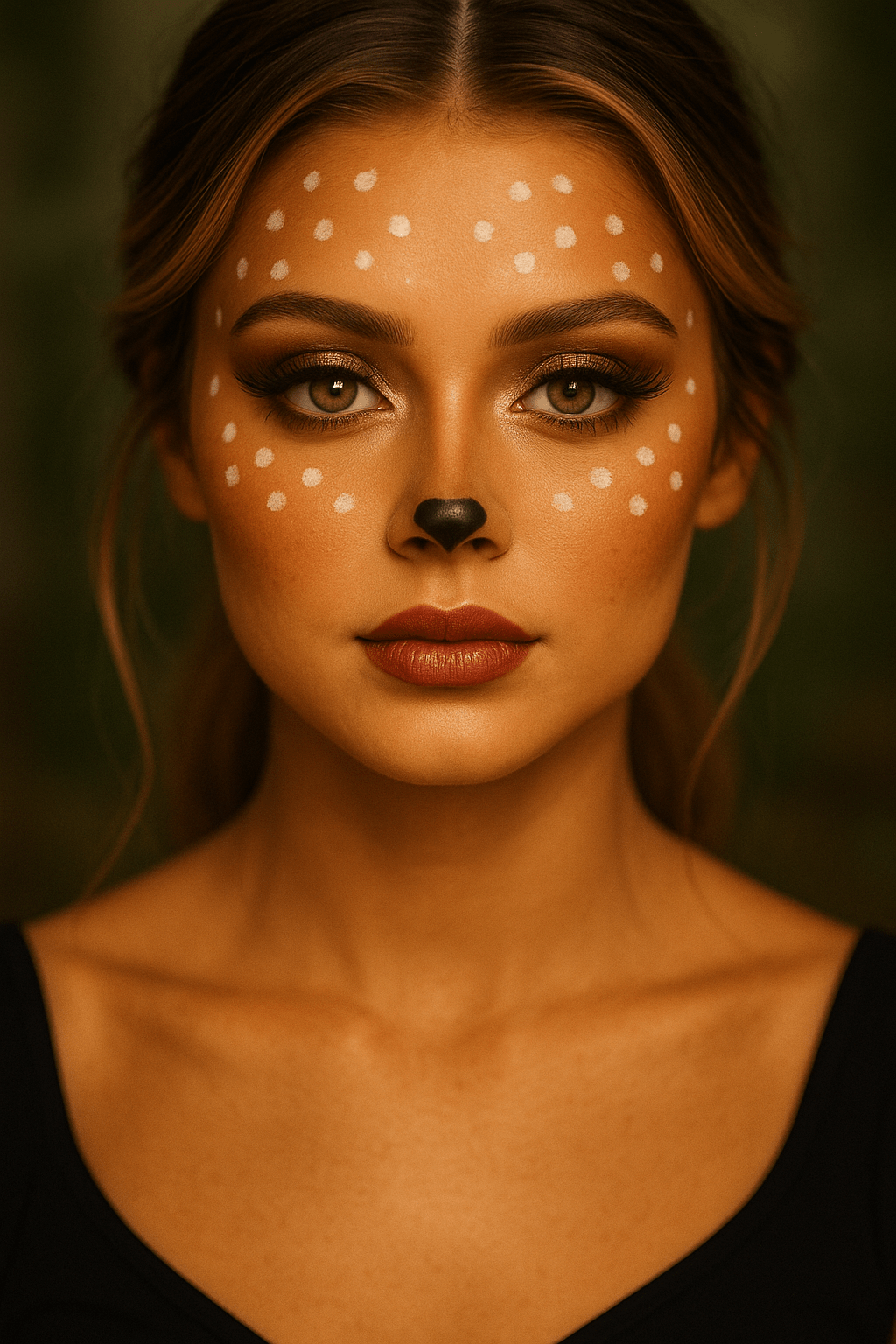 Das Reh Makeup gehört zu den zarten, verspielten Halloween Looks. Es wirkt niedlich, ein bisschen märchenhaft und lässt dich sofort wie aus einem Waldtraum entspringen.