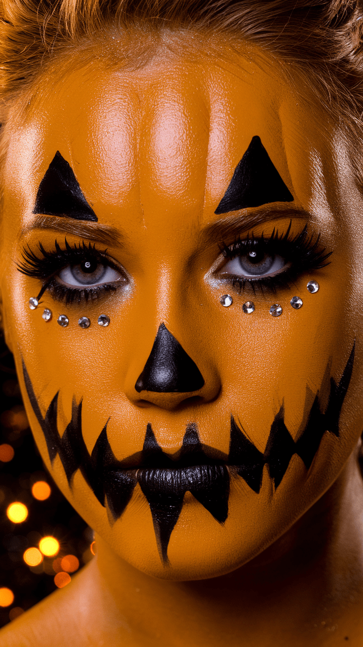 - Extras: Grüner Lidschatten oder Haarfarbe für die Haare verstärken den Kürbis-Look.