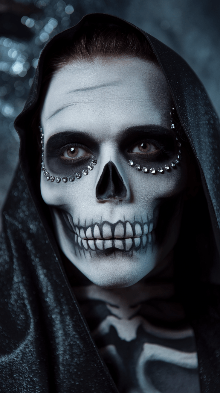 Dieser Look verbindet Grusel mit Eleganz. Du wirkst wie ein Skelett, das direkt aus einer schicken Halloween-Gala kommt.