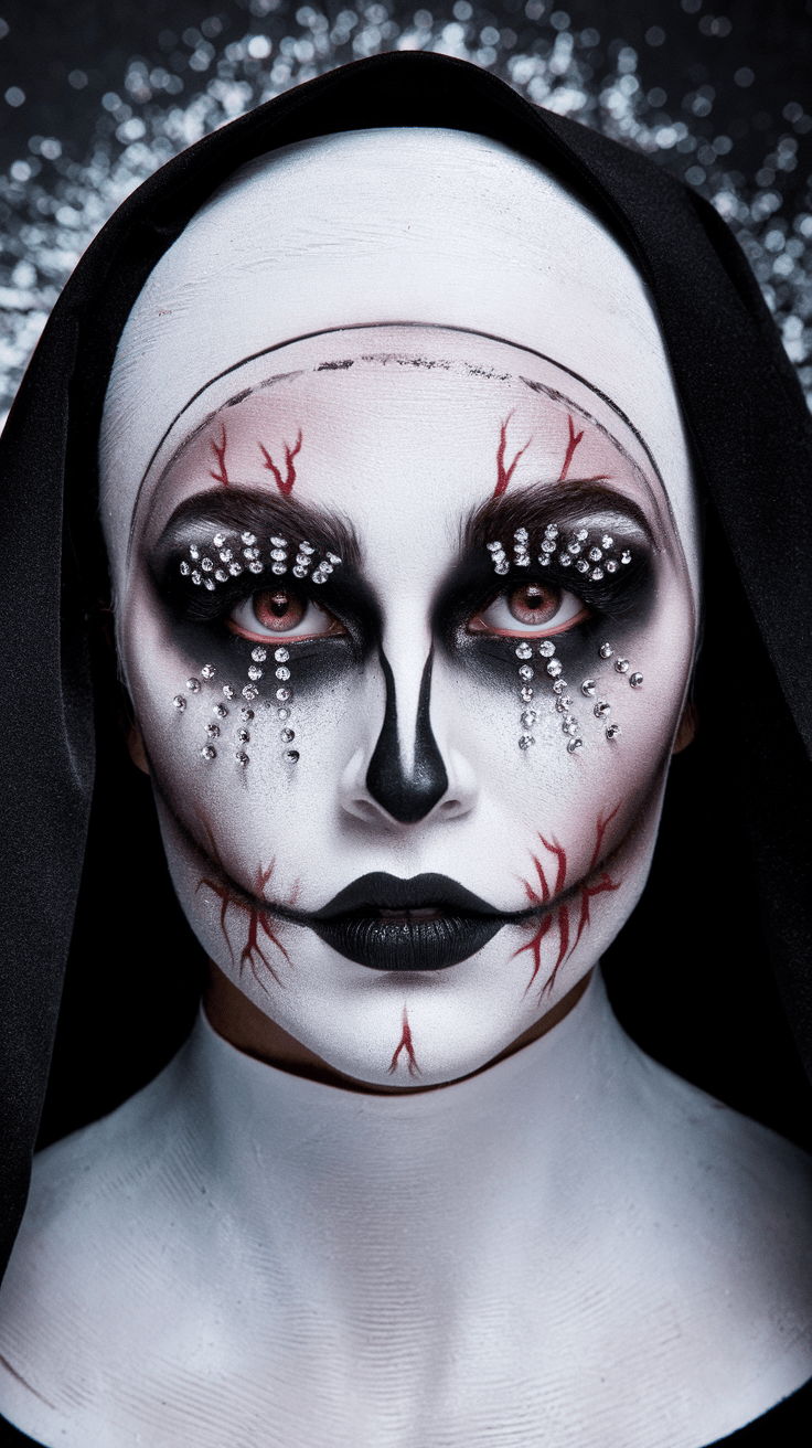 Dieser Look ist von Horrorfilmen inspiriert und sorgt garantiert für Gänsehaut. Die dämonische Nonne wirkt bedrohlich, düster und unvergesslich.
