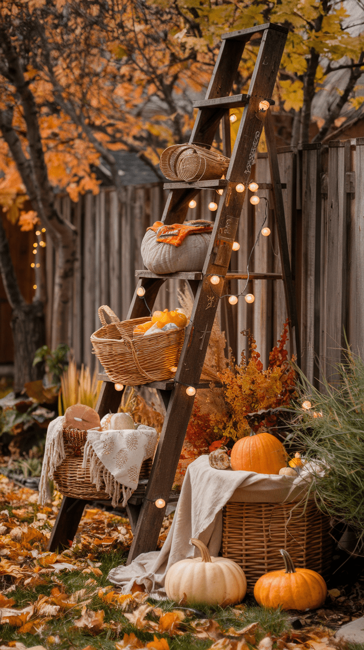 Eine alte Holzleiter ist ein Geheimtipp für alle, die draußen vertikal dekorieren wollen. Sie bietet viel Platz auf wenig Raum und verwandelt sich mit der richtigen Deko in ein echtes Highlight. Perfekt für Eingangsbereiche, kleine Terrassen oder Gärten.