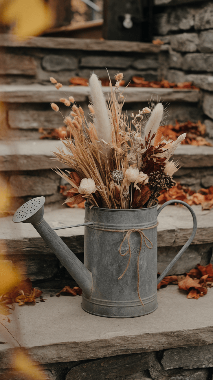 - Befülle die Kanne mit Trockenblumen, Gräsern oder bunten Blättern.