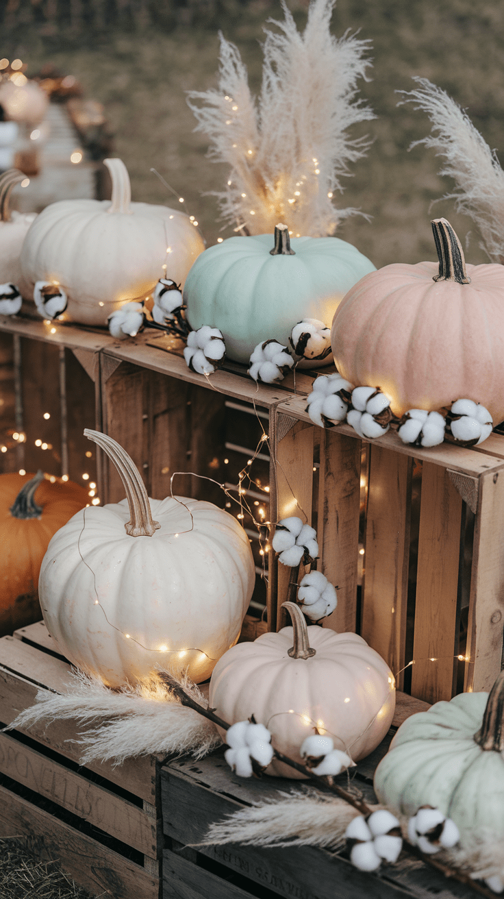 - Weiße oder mintfarbene Kürbisse auf Holzkisten arrangieren.