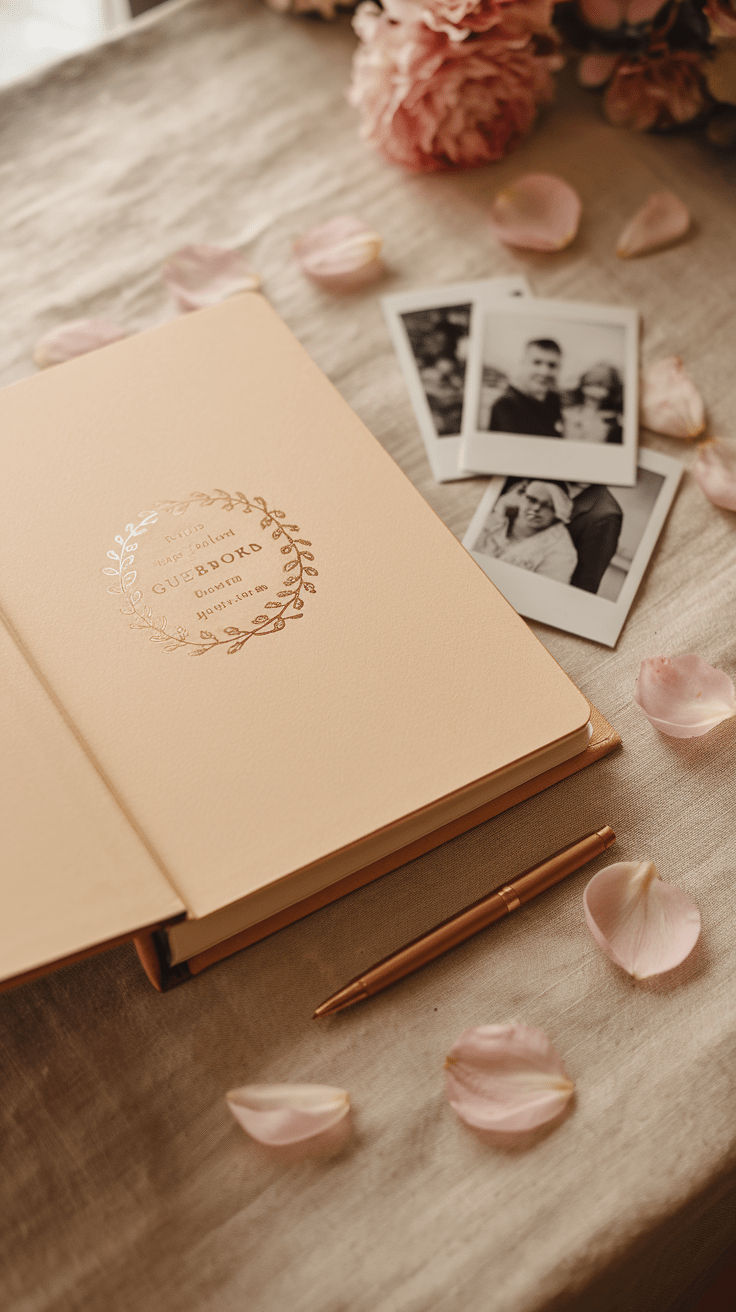 Stell das Gästebuch an einen ruhigen Ort, am besten mit hübscher Beleuchtung und ein paar Deko-Elementen. Lege Stifte, Aufkleber und Washi-Tape bereit. So macht es Spaß, kreativ zu werden.