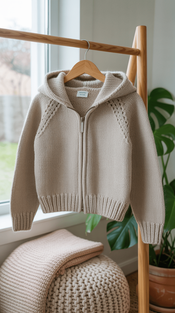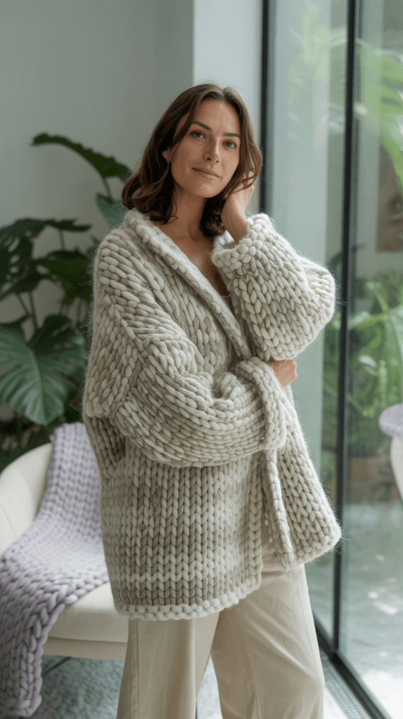 Eine Übergangsjacke mit leichtem Strukturmuster ist ideal für den Frühling und Herbst. Sie liegt locker am Körper und bringt dennoch Textur ins Strickbild. Ich wähle gern ein Rautenmuster für einen dezenten Effekt.