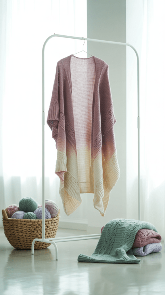 Für eine fließende Optik nutze ich Perlmuster in der Mitte und kraus rechts an den Kanten. Durch leichte Farbverläufe entsteht ein modernes Ergebnis. Achte auf regelmäßiges Spannen, damit die Tunika sauber fällt.