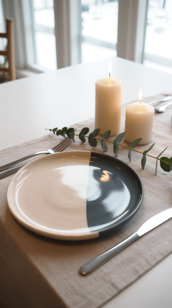 Mit nur zwei Farben kannst du einen richtig modernen Look erzeugen. Diese Teller wirken oft besonders hochwertig.