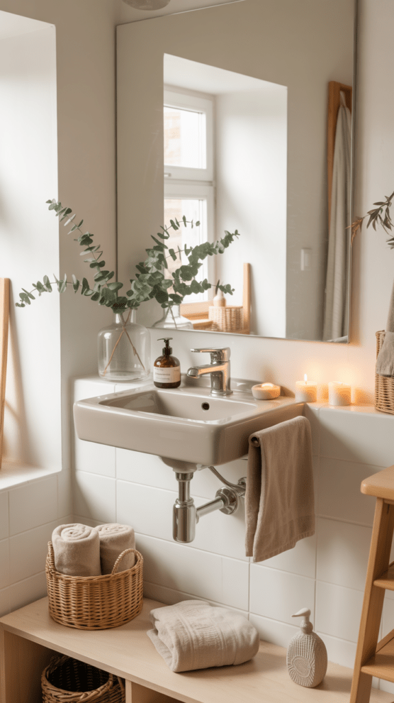 Ein schwebender Waschtisch kombiniert Funktion und Eleganz. Gleichzeitig entsteht unter dem Möbel Platz für kleine Körbe oder dekorative Elemente.