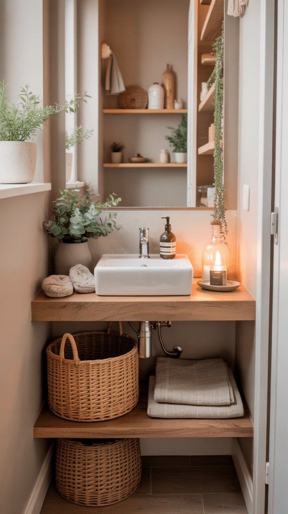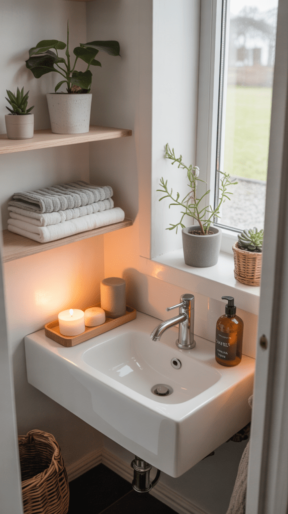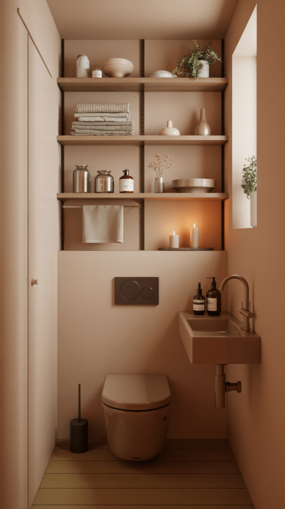 Stauraum ist im Gäste-WC oft Mangelware. Vertikale Regale nutzen die Höhe des Raumes und schaffen Platz für Handtücher, Toilettenpapier oder kleine Dekoration.