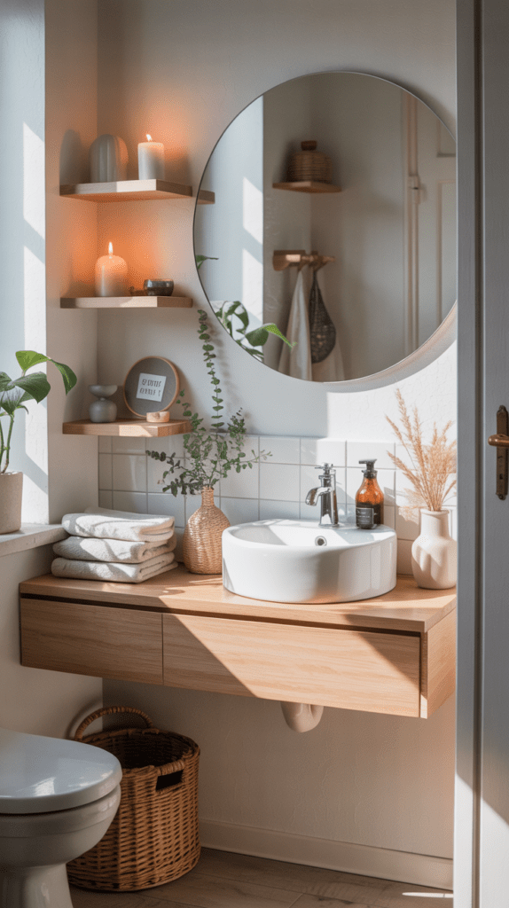 Gerade Linien wirken in kleinen Räumen manchmal streng. Runde Spiegel oder geschwungene Formen bringen weiche Akzente ins Gäste-WC.
