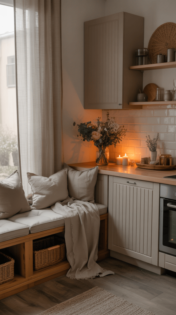 Eine Sitzbank integriert in einer Nische benötigt nur minimale Tiefe und bietet dennoch komfortable Plätze. Unter der Bank kannst du Utensilien oder Vorräte deponieren, ohne zusätzliche Möbel zu benötigen. Du erhältst so eine gemütliche Ecke zum Essen oder Entspannen im Kochbereich. Ein ganzheitliches Konzept verbindet Sitzgelegenheit und Stauraum harmonisch.