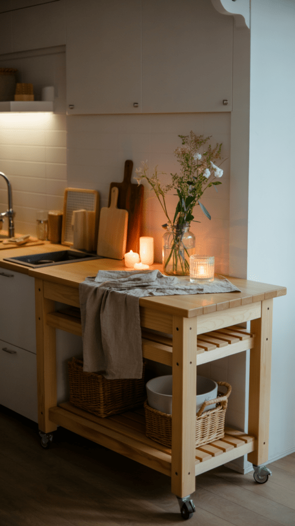 Eine fahrbare Kücheninsel erlaubt es dir, den Raum je nach Bedarf anzupassen. Sie kann als zusätzliche Arbeitsfläche, Bar oder Servierbereich dienen und wandert dorthin, wo du sie brauchst. Dank eines leichten Rahmens bleibt die Insel mobil und unauffällig. Dadurch bleibt deine offene Küche immer im Fluss und wirkt nie statisch.