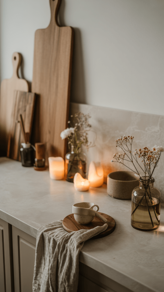 Platziere kleine Kräutertöpfe auf einem schmalen Regal oder hänge sie an Schienen unter den Hängeschränken. Wähle pflegeleichte Sorten wie Basilikum, Thymian oder Sukkulenten. Achte auf genügend Licht und eine schlichte Keramikverpackung in neutralen Tönen. So bleibt der Fokus auf den natürlichen Formen und Farben.