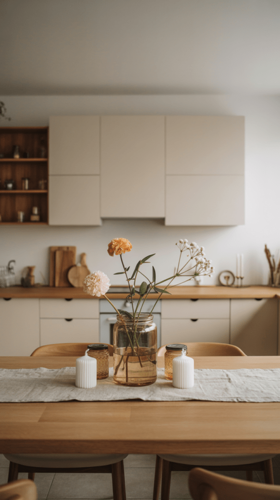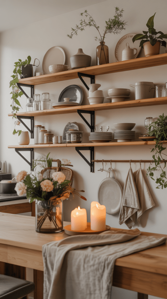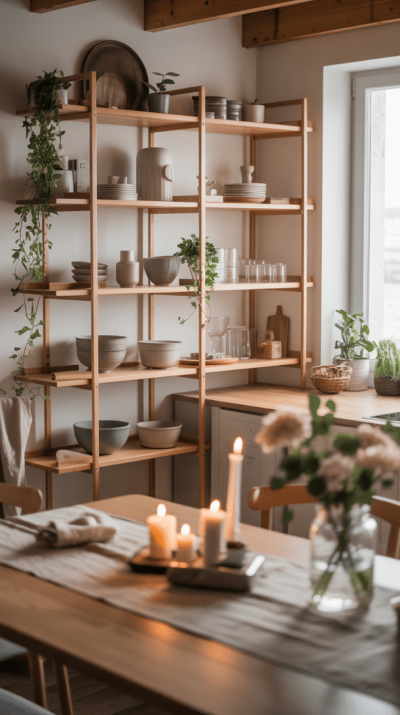 Leichte Holzregale, die direkt an der Wand befestigt sind, schaffen Stauraum ohne sperrige Oberschränke. Sie wirken luftig und lassen die Küche offener erscheinen. Du kannst Kochbücher, Pflanzen oder Geschirr darauf arrangieren und hast alles griffbereit. So entsteht ein wohnliches Flair, das gleichzeitig modern bleibt.