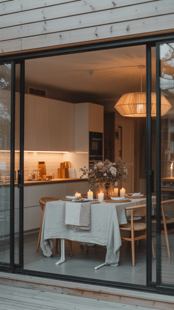 Statt herkömmlicher Drehtüren schaffen Schiebetüren bewegliche Wände, die Bereiche abtrennen und gleichzeitig Verbindung ermöglichen. Sie benötigen wenig Platz und lassen den Raum fließend erscheinen. Du kannst die Küche bei Bedarf von Wohn- oder Essbereich trennen und gelangst dennoch schnell zurück. Die geradlinige Bewegung unterstreicht ein minimalistisches Konzept.