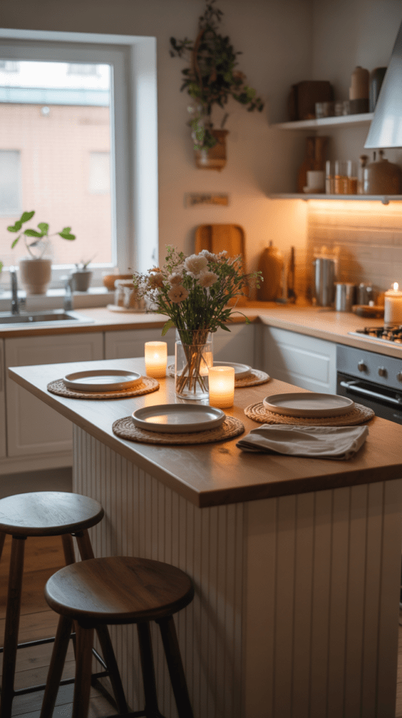 Eine kühl abgestimmte Farbpalette in zarten Pastelltönen verwandelt selbst kleine offene Küchen in ruhige Rückzugsorte. Die Kombination von Mint, Rosé oder Himmelblau fängt das Tageslicht ein und reflektiert es sanft im Raum. Du gewinnst eine freundliche Ausstrahlung, ohne dass die Farben zu dominant wirken. Diese Nuancen schaffen eine einladende Umgebung für entspanntes Kochen und Verweilen.