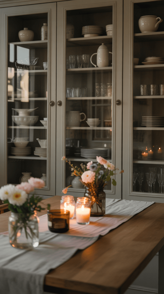 Verwende mattes oder klar lackiertes Glas in Kombination mit schmalen Metallrahmen oder lackierten Holzprofilen. Achte darauf, dass die Scharniere dezent und hochwertig sind, damit die Fronten sich leise öffnen. Platziere dein Geschirr und ausgewählte Deko in harmonischen Farbabstufungen. So entsteht eine ruhige Inszenierung deiner Küchenutensilien.